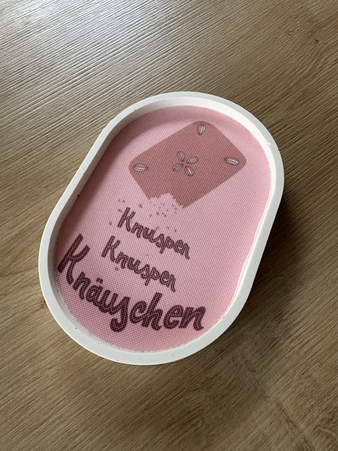 Unsere Haster Form – Schale entsteht Stück für Stück von Hand. Gegossen aus weißem Acryl-Gießharz, das eine matte, sanfte Oberfläche bekommt. Vor dem Gießen legen wir ein Stück Stoff mit farbigem Print in die Form – so verbindet sich das Muster direkt mit dem Material. Kein Druck danach, kein Aufkleber – alles entsteht in einem Guss.